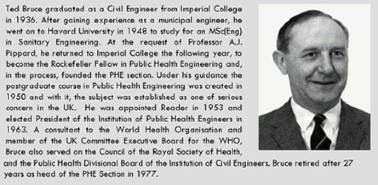 Environmental and Water Resource Engineering at Imperial College began in 1949 following a visit to London by Professor Gordon Fair of Harvard University. It had been noticed that, although British engineers had been pioneers in the development of water supply and waste disposal techniques, unlike their counterparts in North America, its universities had largely confined their teaching to short undergraduate courses. Thus, with 3 years funding from the Rockefeller Foundation, F.E. Bruce was appointed Fellow in Public Health Engineering, a small laboratory was established and a postgraduate course set up jointly with the London School of Hygiene and Tropical Medicine. This postgraduate course began in Oct 1950 with 8 students.