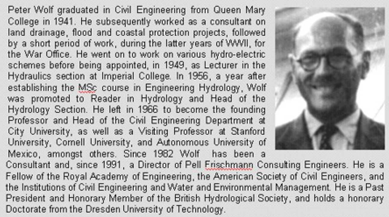 In 1949, P.O. Wolf was appointed lecturer of Fluid Mechanics and Hydraulic  Engineering in the Hydraulics section. His previous professional experience had, however, concerned land drainage, flood-protection and hydro-electric schemes. Thus when, in 1953, a meeting of government hydrologists in East and Central Africa requested that a postgraduate course in Hydrology be established  at Imperial College, the responsibility was passed to Wolf. Aided by the Chief Hydrologist of Kenya, F. Grundy, and his assistant, H. Underhill (who later also became a lecturer), Wolf established the one-year full-time postgraduate course in Engineering Hydrology in Oct 1955. A year later, Wolf became a Reader and Head of the newly formed Hydrology Section.