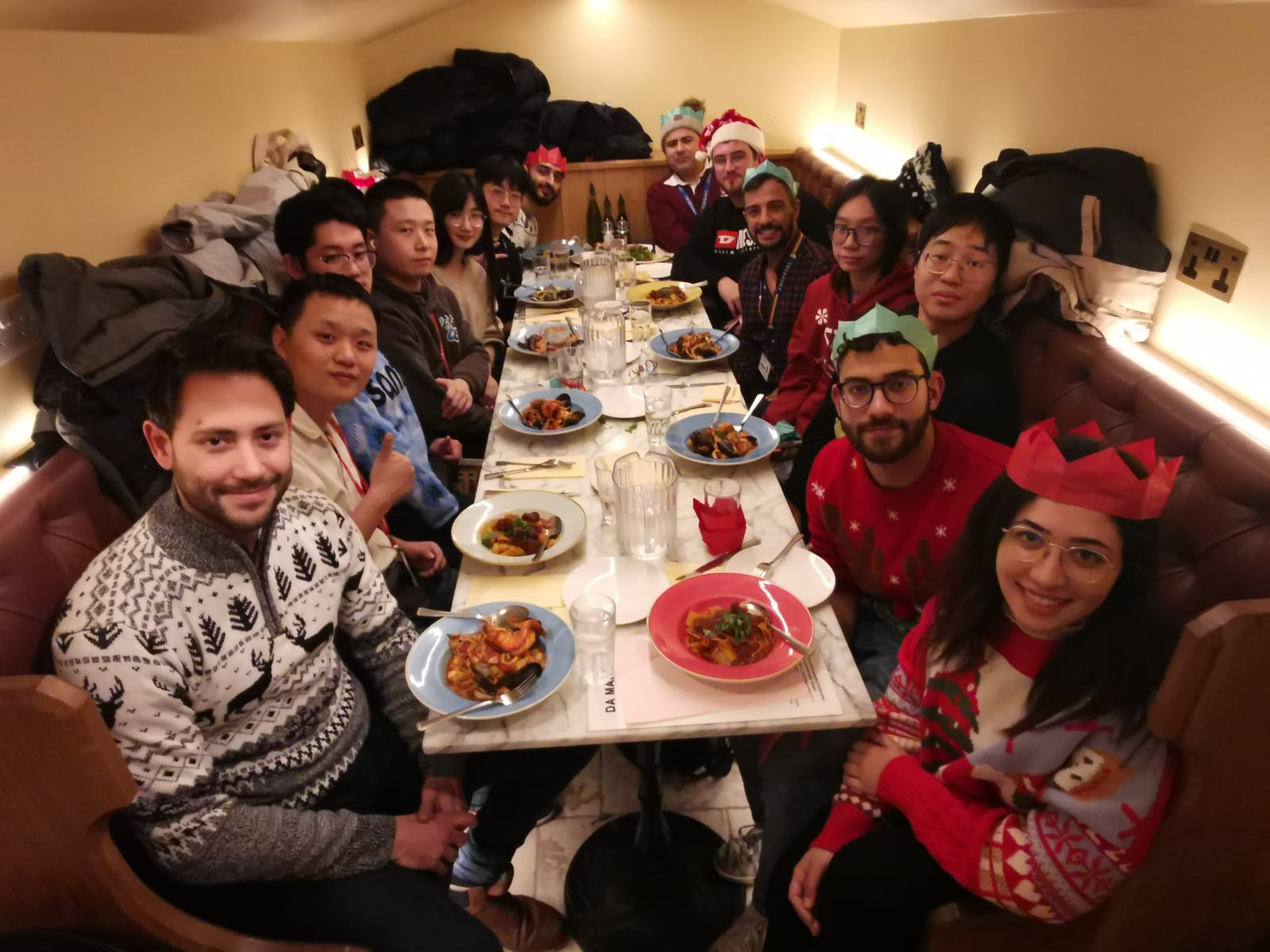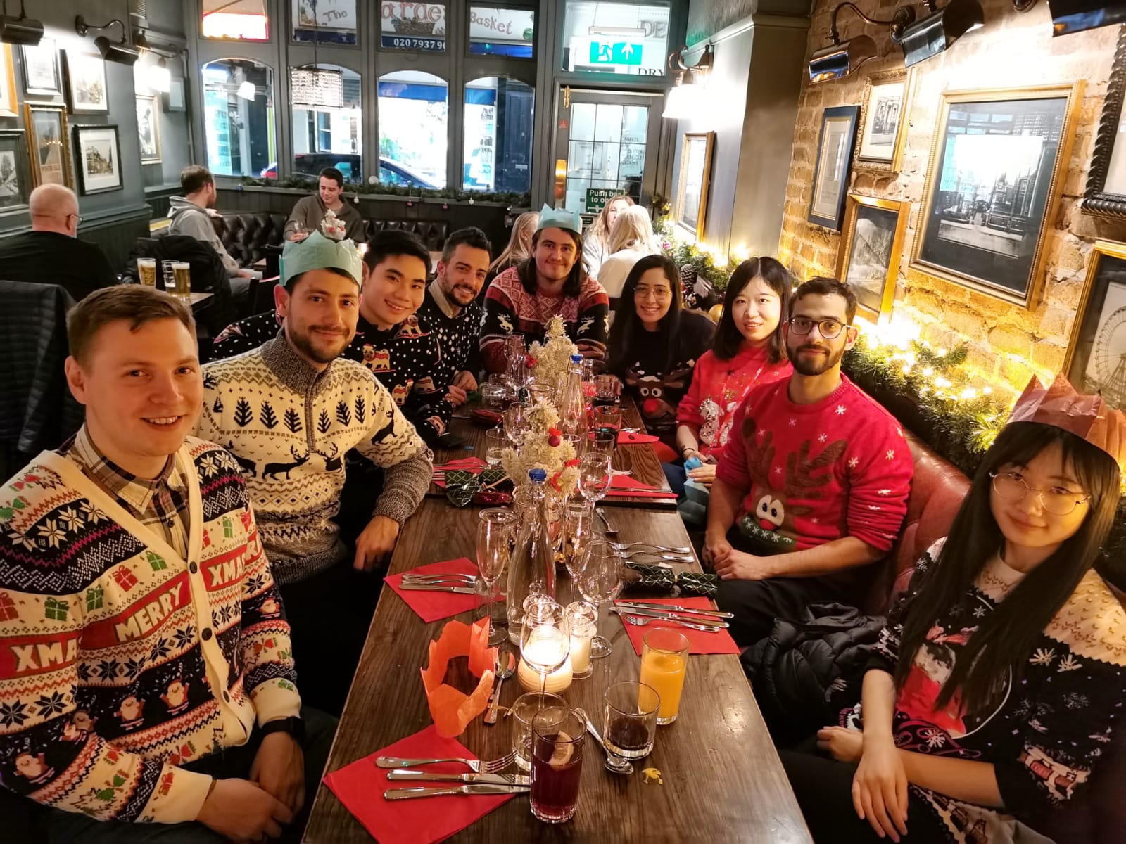 Dec 2019 - Here we have the group (minus Santosh) celebrating the end of the year with a classic pub Christmas dinner at the Hereford Arms! All donned their Christmas jumpers, even if some had to do an emergency shopping trip to Primark, and Salva had to wear the punishment elf hat for not making the effort!