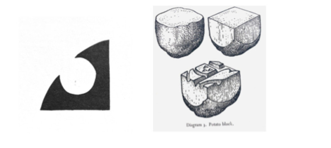 A textile potato printing class exploring the possibilities of one given design carved from potato. Remarkable variety can be achieved by rotating and flipping this design, discover as many variations as you can, noticing the positive and negative spaces in the pattern.. Progress from what you have learnt from this exercise and cut your own design and discover your own potato pattern using the square as your starting point.