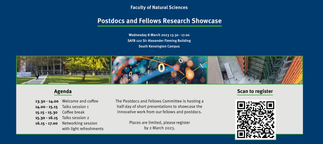 The Postdocs and Fellows Committee (PFC) from the Faculty of Natural Sciences is hosting a half-day of short presentations to showcase the innovative work from our postdoctoral and fellows’ researchers. This event will include a networking session over light refreshment – please see schedule and confirmed speakers below!