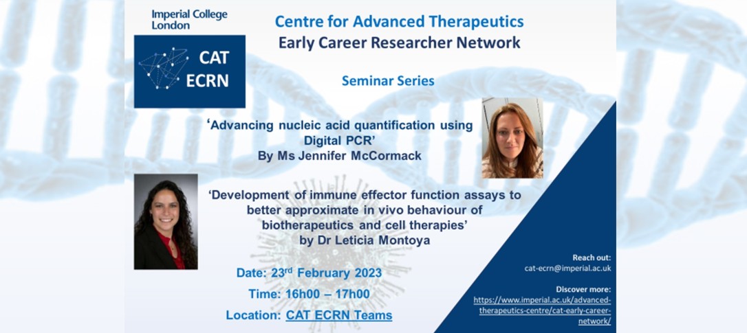 The Centre for Advanced Therapeutics Early Career Researcher Network is delighted to host two researchers from Thermo Fisher Scientific. The first, Ms Jennifer McCormack, will focus on using Digital PCR as a technique for absolute quantification of DNA compared to qPCR. The second, Dr Leticia Montoya will present new methods to study the specific killing of target cells by immune cells, which is critical to help accurately assess the in vivo behavior of these approved biotherapeutics and cell therapies.