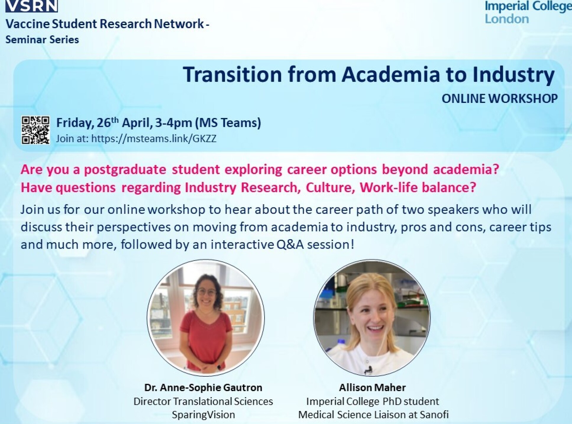 Join us for our online workshop to hear about the career path of two speakers who will discuss their perspectives on moving from academia to industry, pros and cons, career tips and much more, followed by a Q&A session.