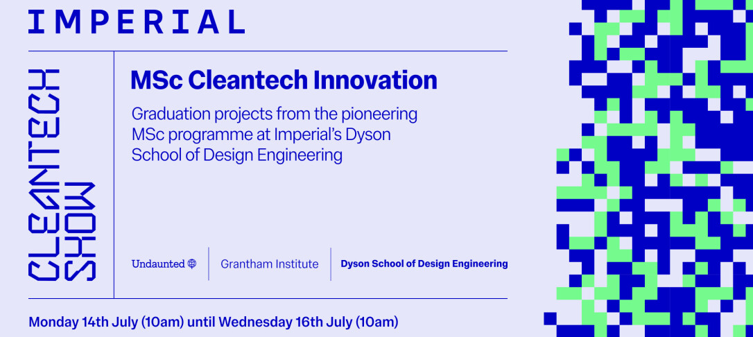This pioneering MSc programme – a joint initiative between the Grantham Institute and the Dyson School of Design Engineering – gives students the opportunity to learn from experts from across the cleantech sector and provides them with the knowledge and tools needed to build and launch their own cleantech solutions.As this year’s students complete their MSc journey, join us for a special event showcasing their creative and inspiring projects, and find out where they’re going next as they launch their innovations into the world.