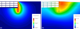 Figure 2: Numerical simulation of a retaining wall problem (a) temperature contours and (b) displacement contours
