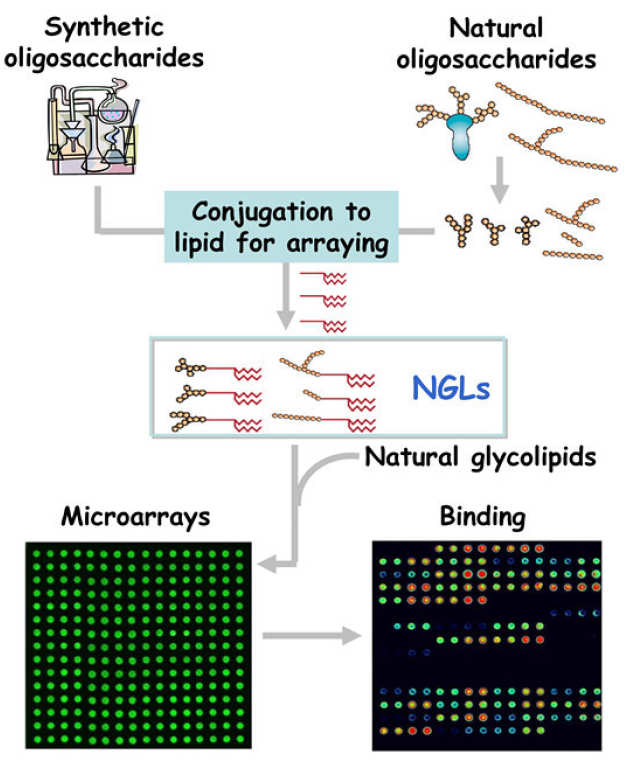 We established the neoglycolipid (NGL)-based oligosaccharide microarray system in 2002, the first to have been set up for sequence-defined oligosaccharides. Oligosaccharide microarrays have revolutionised the molecular dissection of carbohydrate-protein interactions, and with the increased awareness that oligosaccharides are involved in diverse molecular interactions in health and, directly or indirectly, in the majority of disease processes, the technology has served to attract numerous collaborative initiatives with research groups in the UK and overseas.