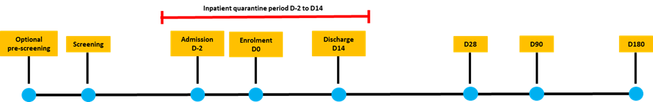 Figure 1: Study timeline (Note that the inpatient quarantine period may extend beyond D14 if you are still infectious)