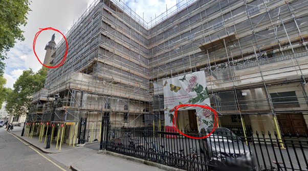 • The entrance to the venue is shown in the photo. Note, that the building is no longer covered in scaffolding.