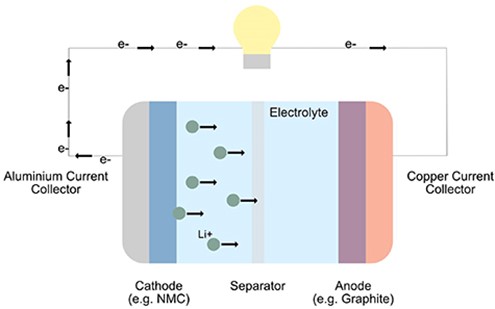 A Li-ion battery is a rechargeable, secondary battery. Its operation is based on the reversible intercalation of lithium ions into a crystal structure to store and release charge. A Li-ion battery cell is made up of a cathode and an anode, separated by a porous membrane, all wetted by the electrolyte.1