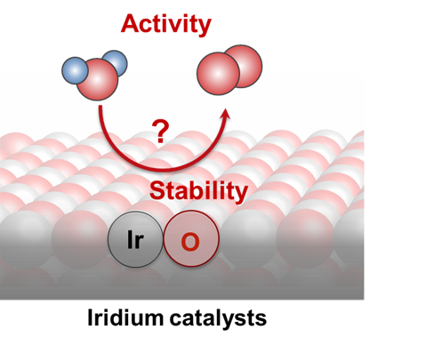 State-of-the-art water electrolysis technology uses an acidic proton exchange membrane as the electrolyte, requiring the use of iridium to catalyze the oxygen evolution reaction (OER) for its incomparable stability in acid. Because of the scarcity of iridium, there is an urgent need to reduce its loading while maintaining activity and stability. Understanding the reaction mechanism and the species governing activity and stability of iridium oxides during water oxidation will enable a better design of active iridium catalysts with low iridium content. Our group aims at combining a series of operando techniques to unravel the fundamental origin of activity and stability of iridium oxides with various structures. We use spectroelectrochemistry (UV-vis, Raman, and X-ray absorption) to probe intermediate states during water oxidation and use mass spectrometry (electrochemistry - mass spectrometry: EC-MS) and time of flight secondary ion mass spectrometry (TOF-SIMS) to quantify oxygen product and proton penetration. Our work on iridium oxides involves close collaboration with Professor James Durrant's group (Imperial College London) and Professor Jan Rossmeisl's group (University of Copenhagen).