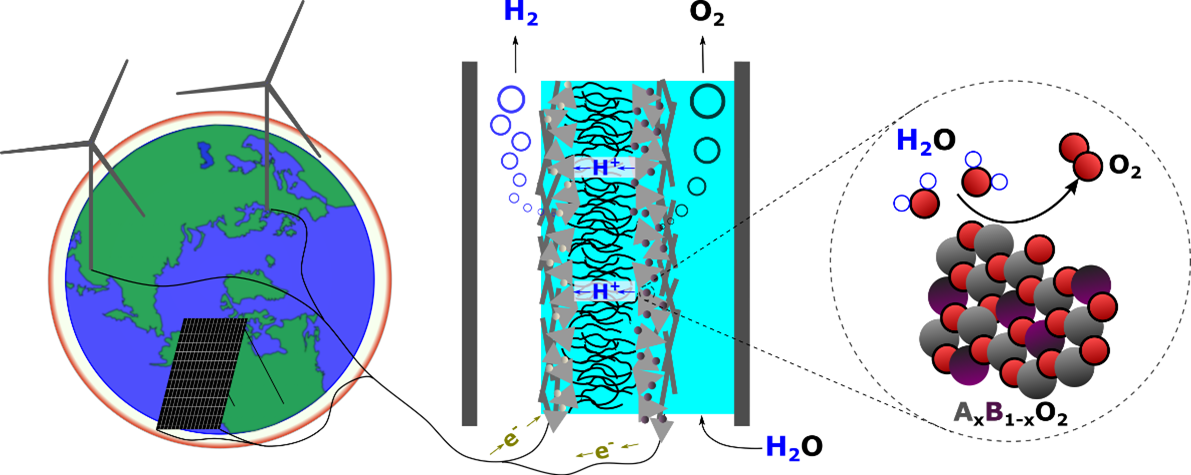 A major materials bottleneck in the green energy transformation looms in the requirement of iridium to oxidize water at the anodes in polymer electrolyte membrane (PEM) water electrolysis cells. Iridium, a rare element, is not available worldwide at the scale needed for the coming power-to-fuels demand. The challenge of finding a replacement is that most solid materials corrode under the conditions at the PEM anode: low pH and electrochemical potential exceeding 1.5 V vs the reversible hydrogen electrode. A handful of other elements including titanium, manganese, germanium, tin, platinum, and lead are stable, but not active, under typical PEM anodic conditions. By starting with the stable and abundant elements and synthesizing intermetallic oxides, we establish a composition space in which to search for active electrocatalysts. The goal is a material that is stable, conductive, and active – but materials that are stable and conductive only are also of interest as PEM anode supports. Synthesis techniques include magnetron sputter deposition, electrodeposition, and chemical vapor deposition. Novel materials are characterized ex-situ by grazing-incidence x-ray diffraction (XRD), x-ray photoelectron spectroscopy (XPS); and investigated in PEM conditions with EC-MS, ICP-MS, and spectroelectrochemistry. We collaborate with the computational group of Aron Walsh to screen candidate materials.
