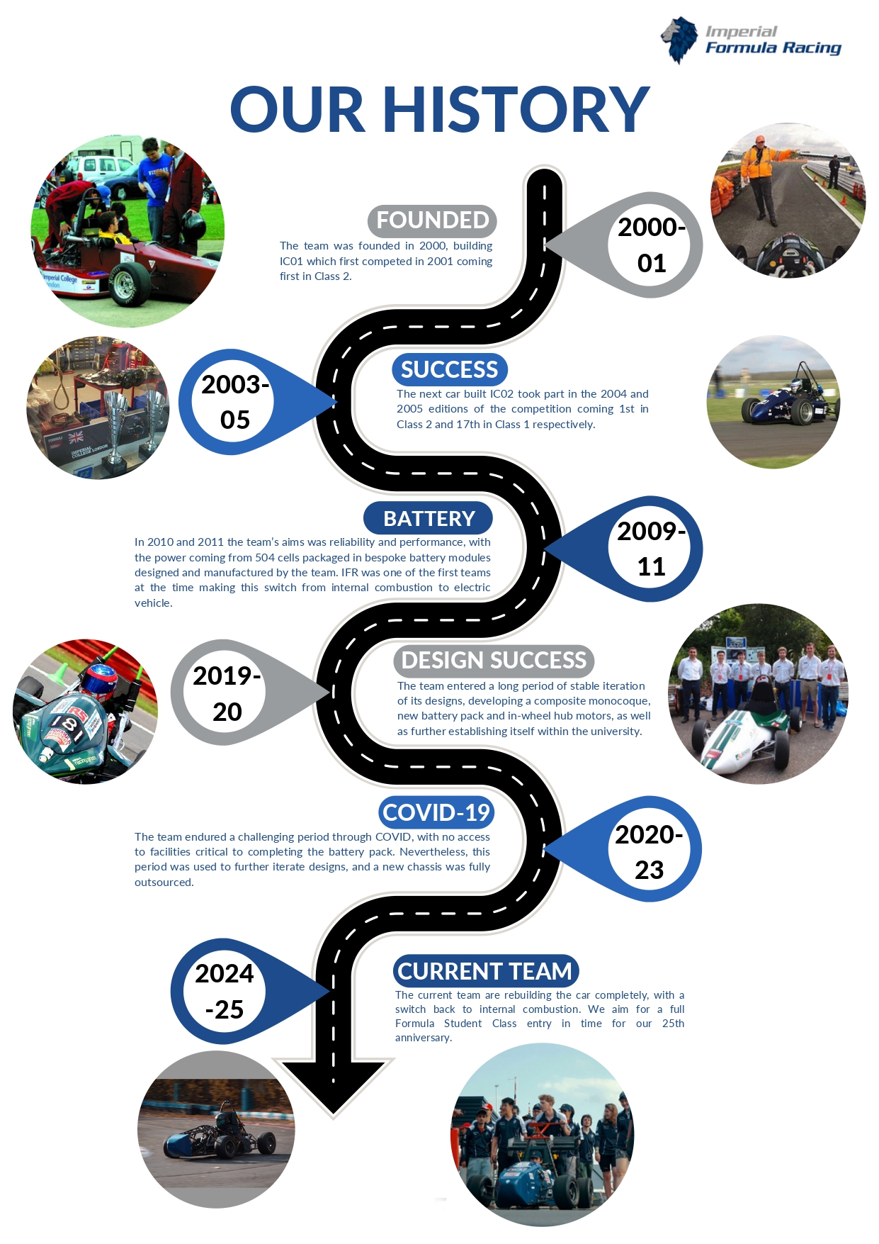 Current team: The current team are rebuilding the car completely, with a switch back to internal combustion. We aim for a full Formula Student Class entry in time for our 25th anniversary.