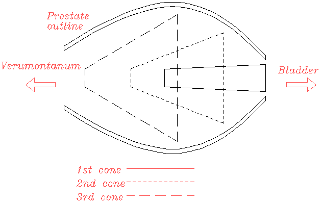 Theoretically, it is possible to combine motions of the motors within the robot to sweep out smooth curved cuts from within the prostate. Initially, however, to ease the control strategy and ensure safety (as it is easier to write a safe simple controller than a complex one), the robot has been programmed to move just one axis at a time, with the result that the cavity is formed as a sequence of overlapping cones. In theory, the cone is the largest shape than can be cut, in reality the base shape of each 'cone' is set by the surgeon. The following drawing shows a somewhat exaggerated series of overlapping cones. In reality cones near the bladder neck would be closer together to minimise the steps that the procedure produces in tissue.