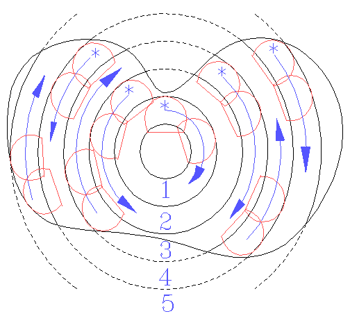 The above sketch shows a possible prostate boundary drawn by the surgeon. This will be cut in five rings of cones, starting at the centre (1) and moving outwards. Note that the shape is irregular so some of the rings of cuts will not be complete circles. For simplicity only the first two cuts in each ring sequence are shown. The arrows indicate the direction of progress and the *s indicate the first cut to be made in each ring. Adjacent cuts and rings are overlapped slightly to ensure that all tissue is removed.