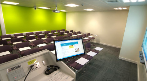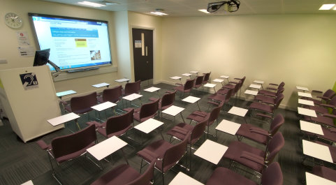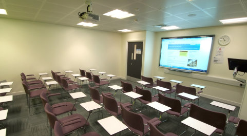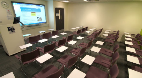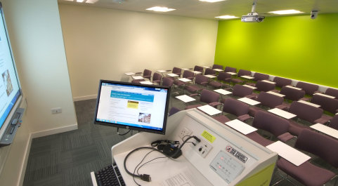 - Room facilities: 27 networked PCs, 1 Presenter PC, wall-mounted screen, flip chart, whiteboard, roving neck mic