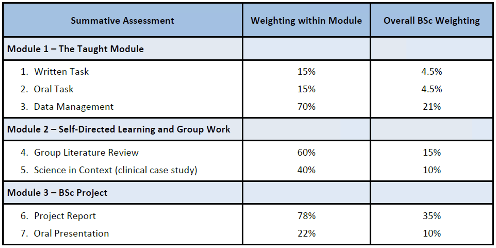 With the exception of BSc Humanities, Philosophy and Law, which has a different assessment structure, all BScs are assessed via 7 items of summative assessment. Please find the BSc mark breakdown below:
