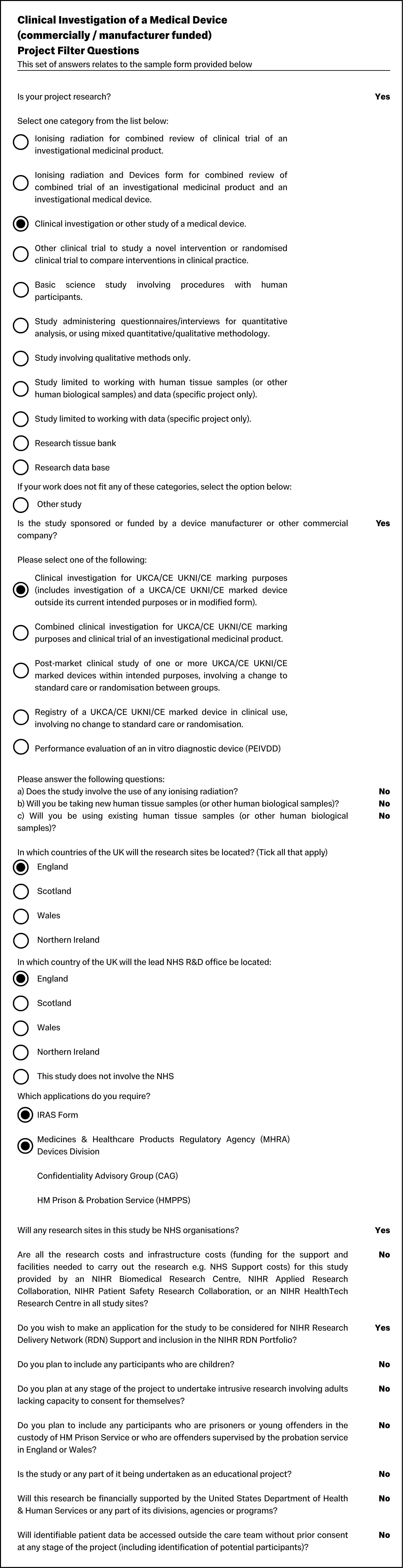 As there is a huge number of possible combinations of answers to the project filter questions that define the IRAS form you need to complete, we have only recorded a small number of the most common forms. If your project does not fall under one of the forms recorded here, you can use the IRAS system to generate the one you need by following these instructions: