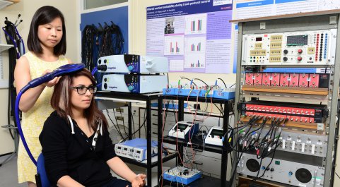 In the Nick Davey Neurophysiology Laboratory, Paul Strutton and a student are conducting cortical and reflex control of movement tests