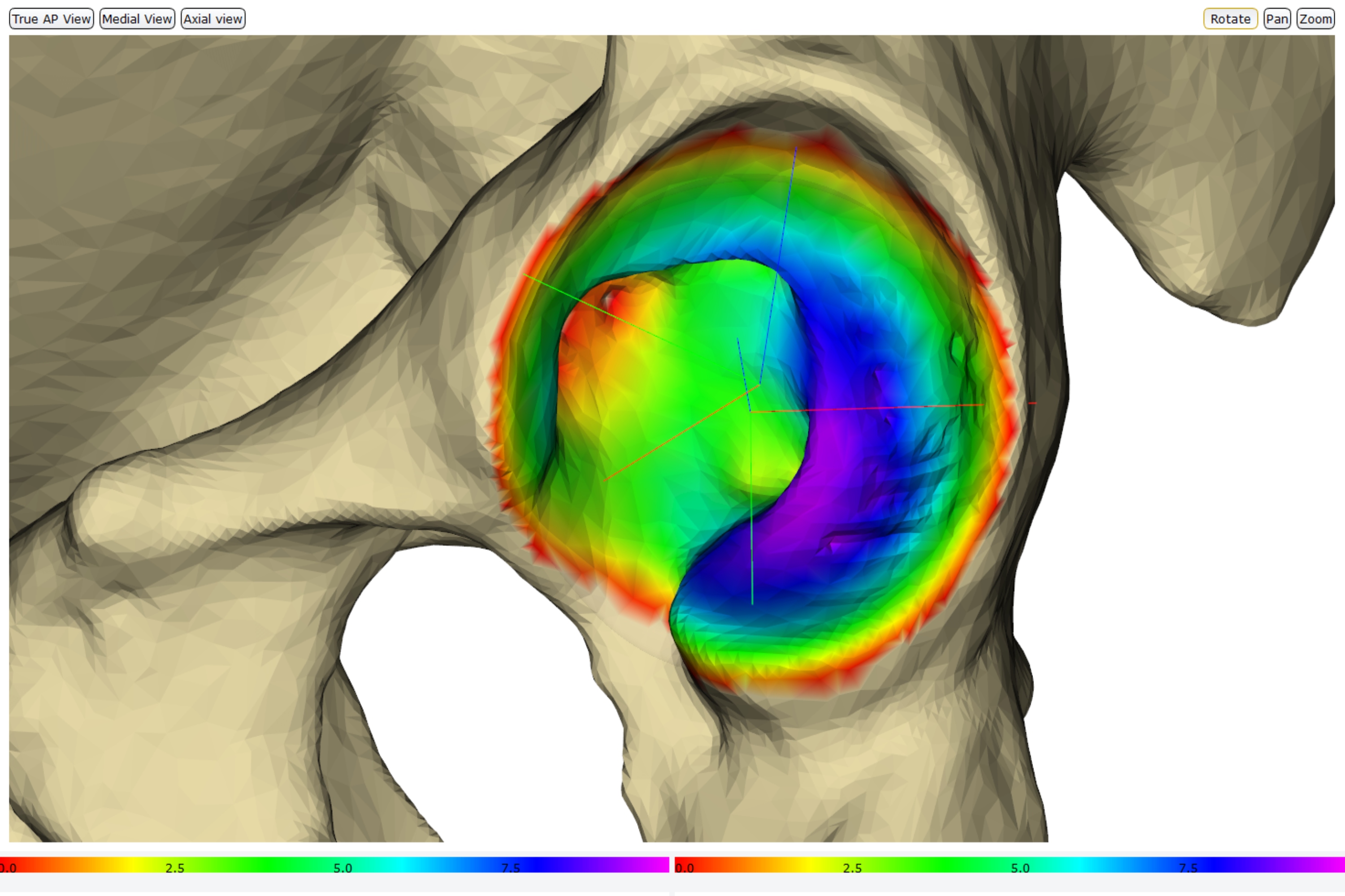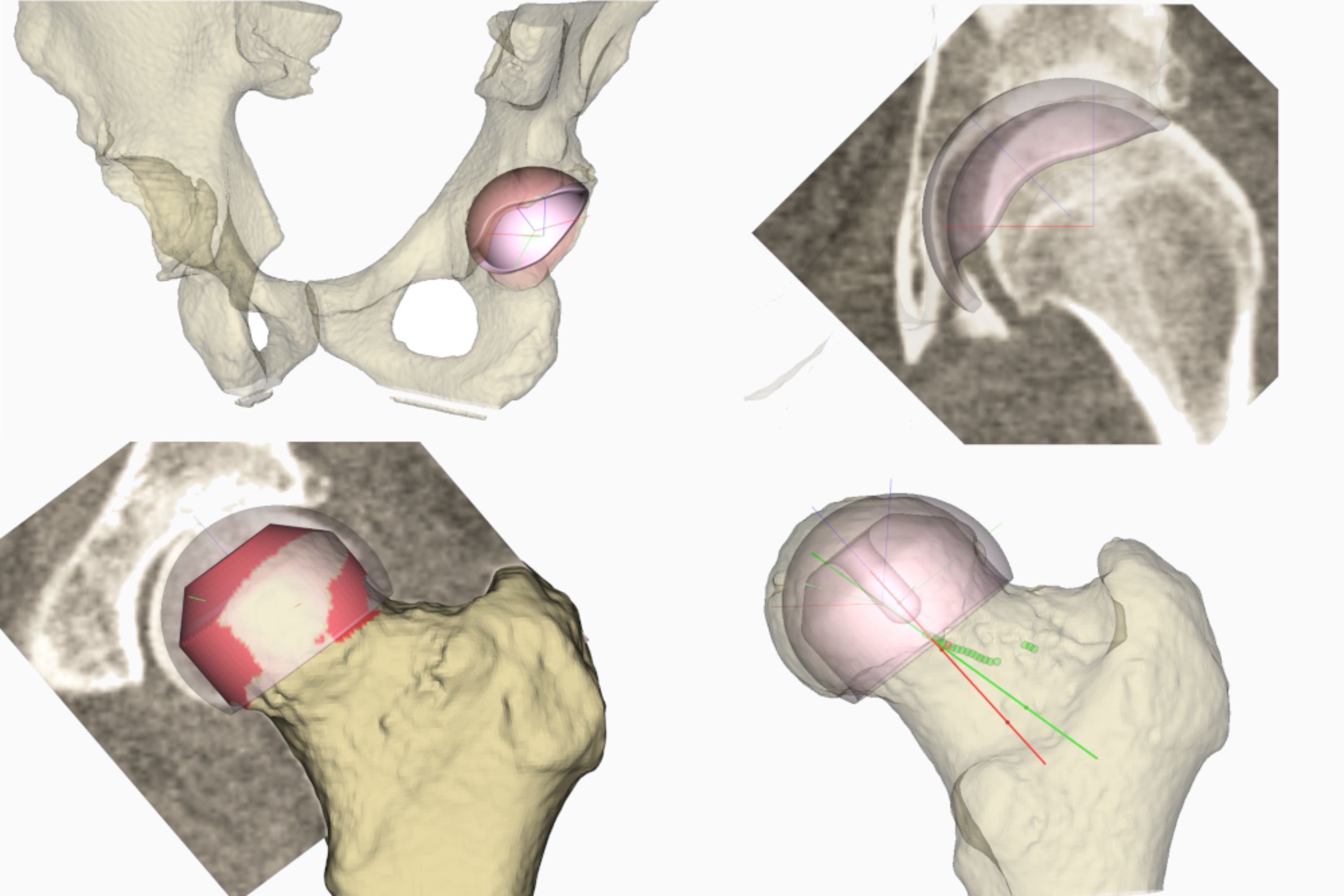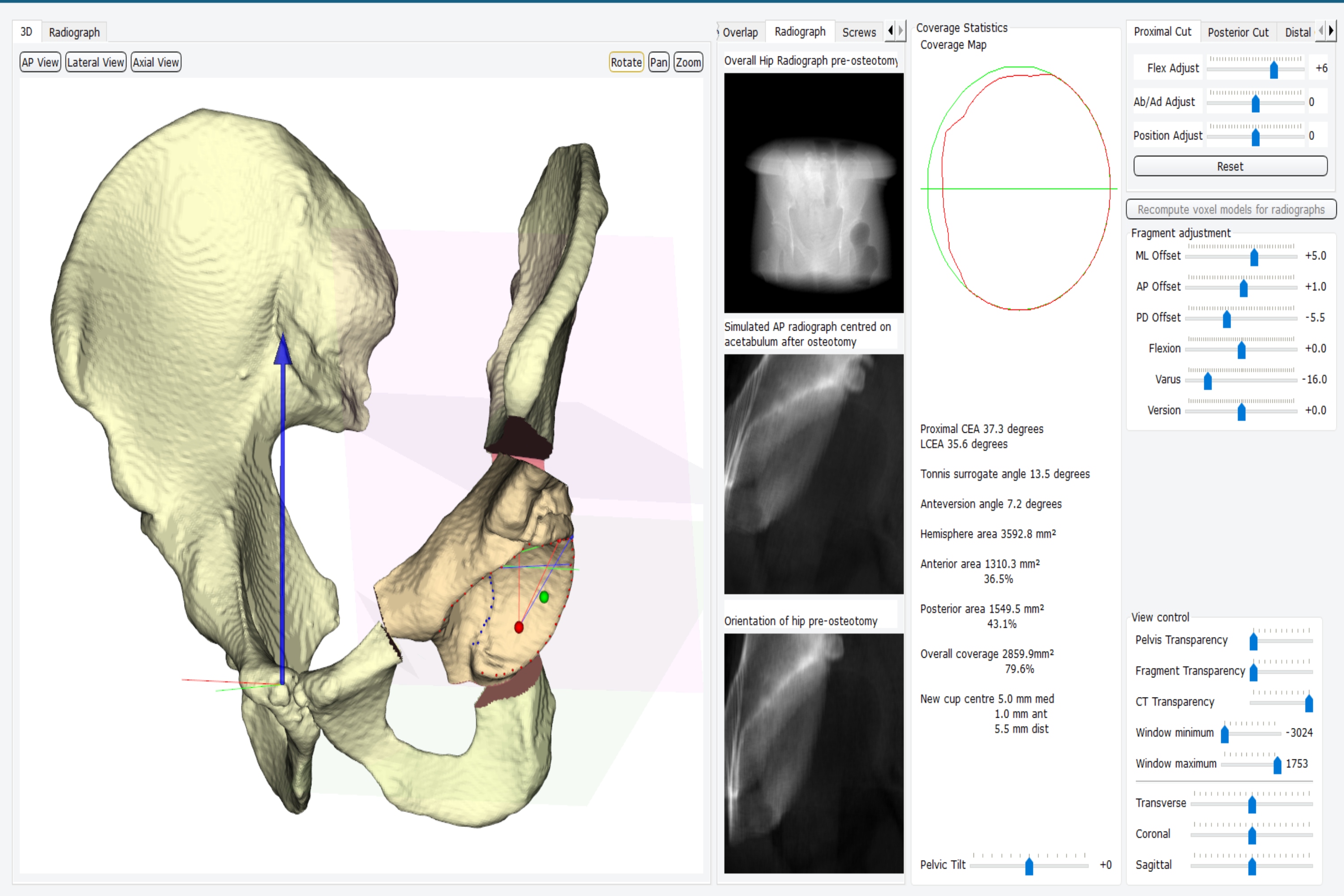 By planning a realignment in the pelvis using what is called a peri-acetabular osteotomy, where the acetabular cup is cut out, realigned and fixed back into place, we can obtain a more stable hip that is less prone to dislocation in patients with hip dysplasia. Real-time feedback while planning provides the surgeon with measurements of the expected improvements in how the relocated cup is covering the head of the femur.