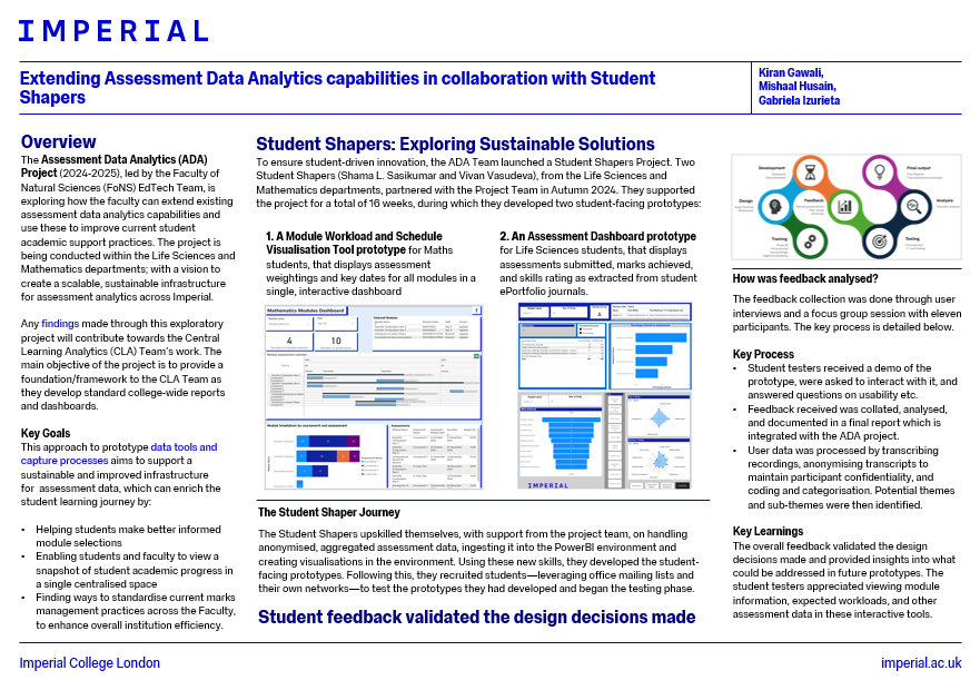 The Assessment Data Analytics (ADA) Project (2024-2025), led by the Faculty of Natural Sciences (FoNS) EdTech Team, is exploring how the faculty can extend existing assessment data analytics capabilities and use these to improve current student academic support practices. The project is being conducted within the Life Sciences and Mathematics departments—with a vision to create a scalable, sustainable infrastructure for assessment analytics across Imperial.