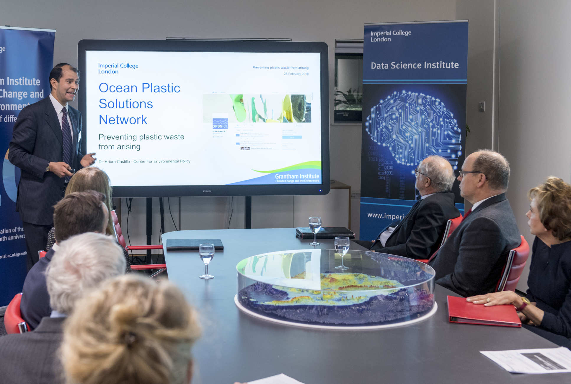 After the lecture, HSH Prince Albert met start-up companies formed by Imperial students and alumni with a focus on sustainability, including water filtration system CustoMem, and ocean plastic pollution mapping program The Plastic Tide. HSH was also presented with a bespoke 3D-printed surfboard, created from recycled waste plastic, by Surfff. The prince and his delegation also met Imperial students from Monaco at a reception.