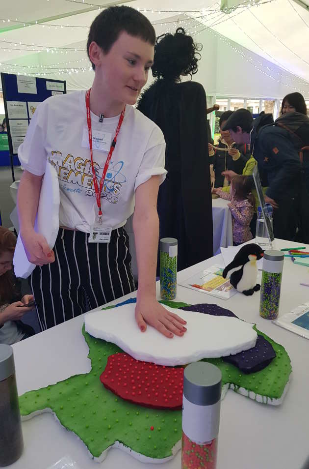 The visitors learned that elements contain neutrons, electrons and protons, and made some model atoms by putting different numbers of marbles and pom-poms into a small pot.