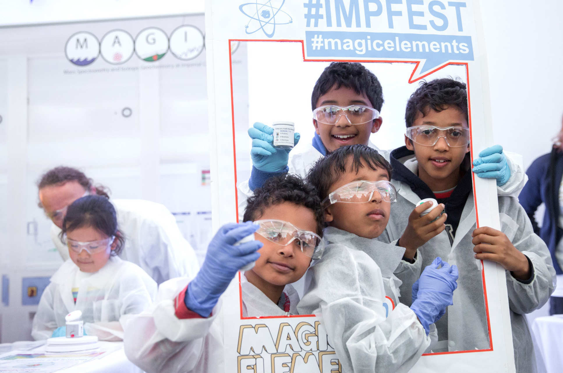 Children donned lab coats and safety goggles to learn about what makes up an element.