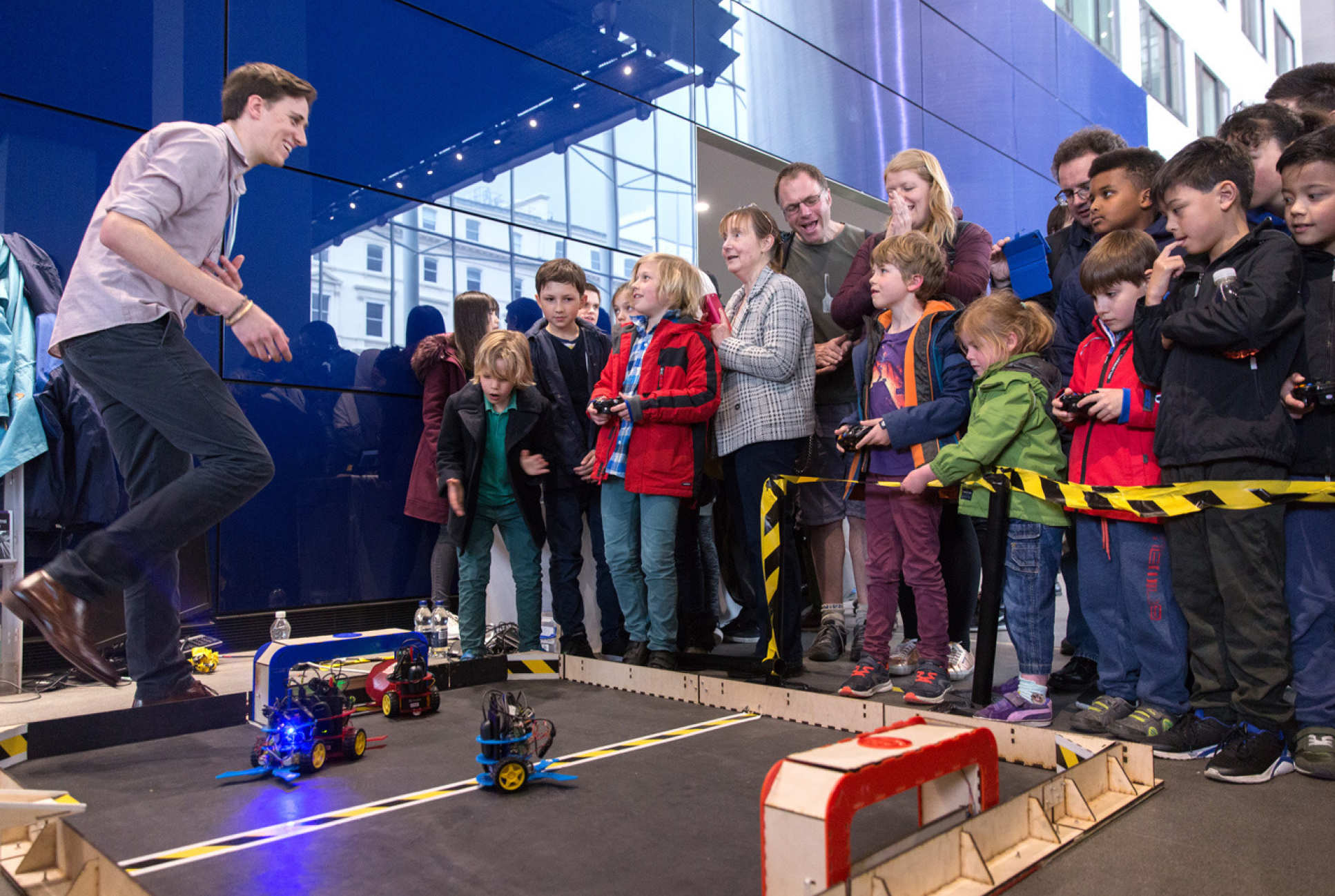 Children put four mini robots to the test in the Robot Zone in a game of robo-football.
