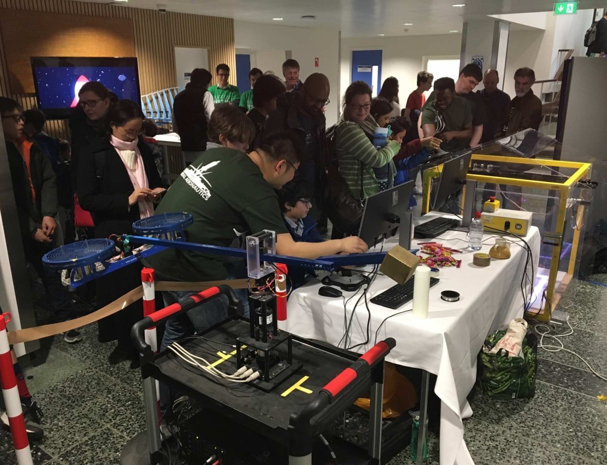 Over 700 people enjoyed the highly interactive crane and tilt-rotor aircraft control exhibit which showed how software and algorithms can be used to interact with the real world in real-time. Visitors were given the chance to manually control an overhead gantry crane through a maze and to land a laboratory scale tilt-rotor aircraft. Inevitably, this resulted in many broken mazes and crashed aircraft! An underlying computer control algorithm was then activated. These algorithms visibly stabilized the crane and tilt-rotor craft, allowing visitors of all ages to perform complex manoeuvres. Remarkably, the same simple underlying algorithm was used for control of both the crane and the aircraft – two very different systems.