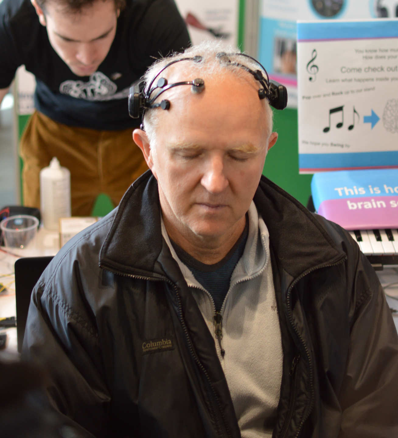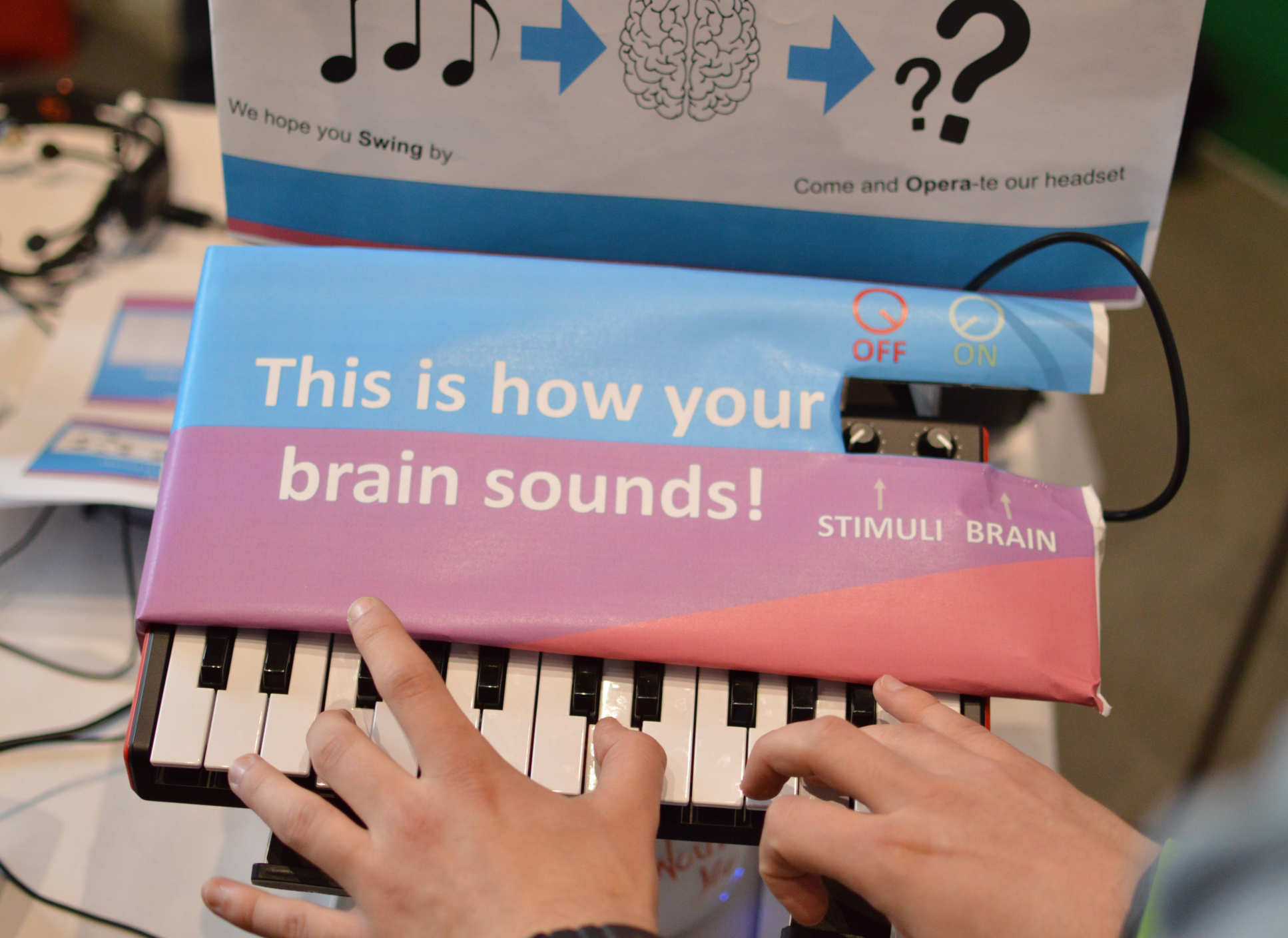 Last but not least the students showed the visitors what their brains actually sound like! Before the Festival the students conducted an experiment in which one student was presented with series of tones, whilst his brain activity was measured via electrodes. Later the signal obtained in response to each tone was processed and could be played back to produce a sound. The students then mapped the ‘sounds of the brain’ to keys of a keyboard and allowed the visitors to see for themselves what the brain sounds like and compare it to the sounds that evoked the response!