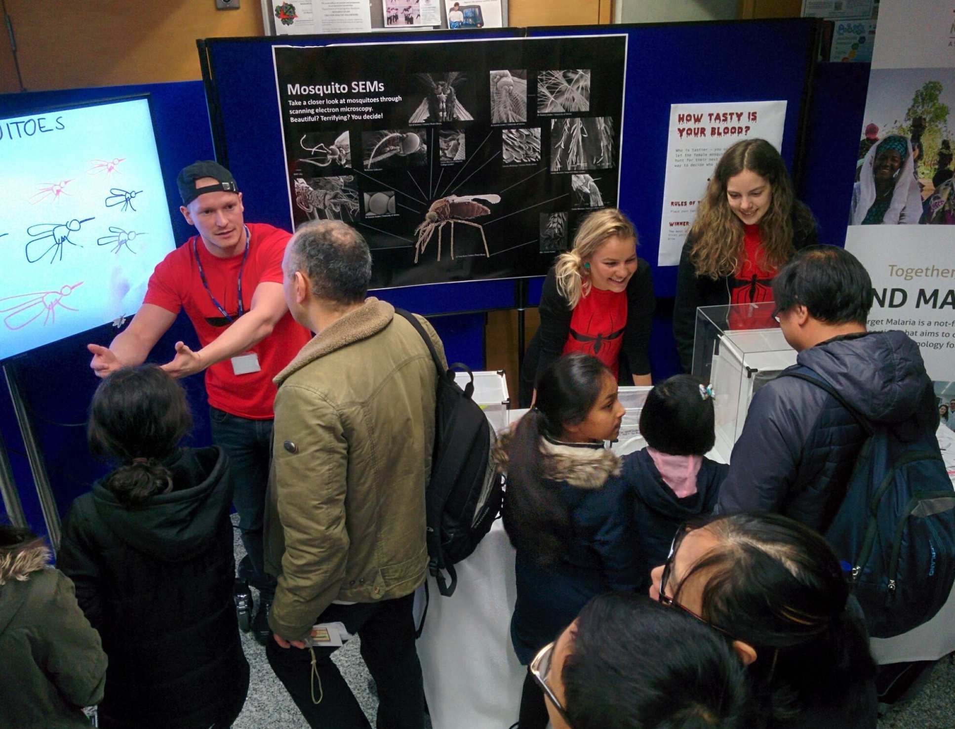 Over the two days of the Festival, both stands saw hundreds of people visit and interact with their creative and engaging activities. At one stand, under the leadership of the Target Malaria team, students and postdocs invited members of the public to play ‘how tasty is your blood?’, an experiment to see whose blood attracted live mosquitoes that they had on display. At the other, researchers from across the Network tested people’s field work skills by equipping them with the knowledge to diagnose malaria from blood smears under a microscope.