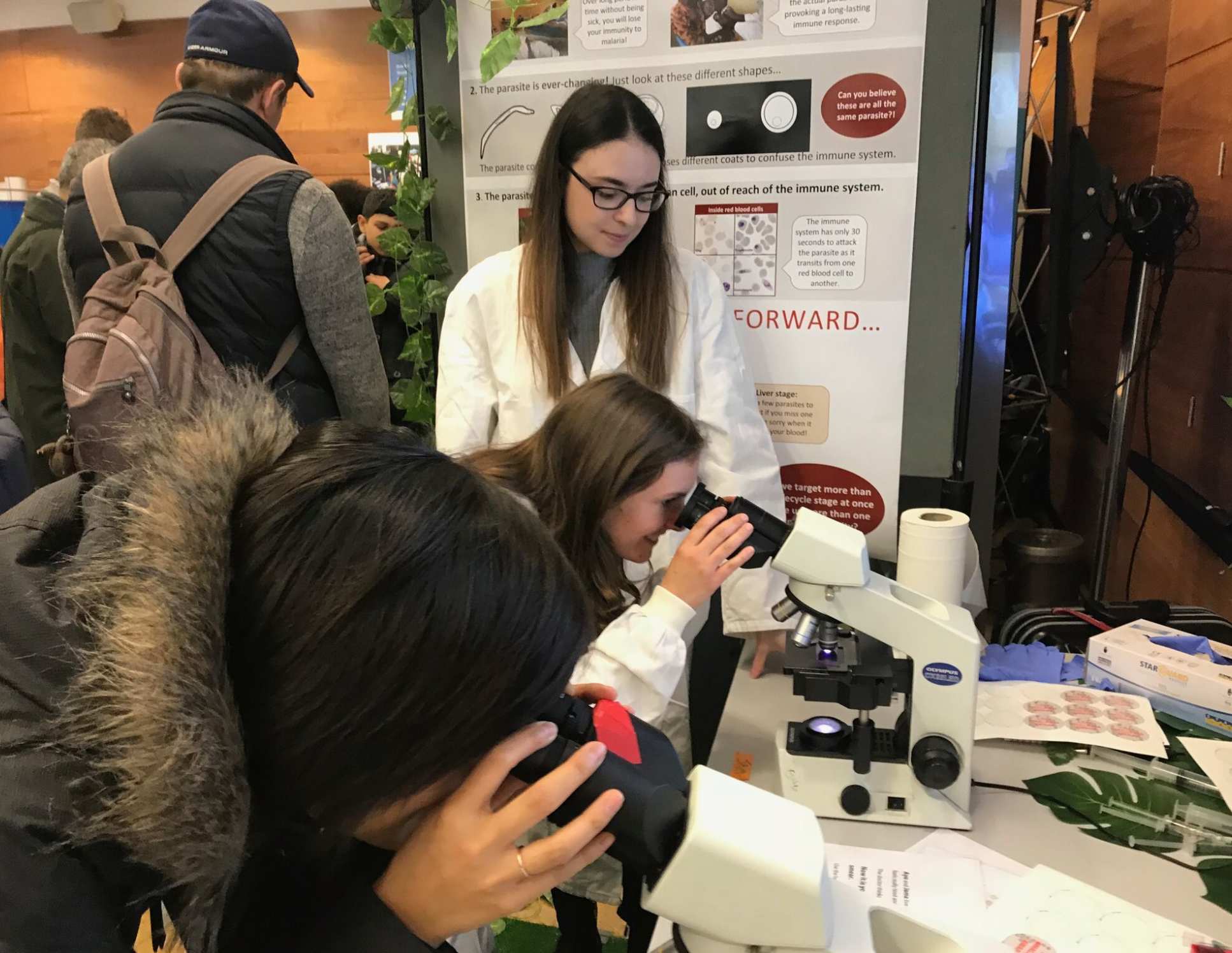 Dr Joshua Blight from the Baum lab was one of the researchers at that diagnostics stand and he shared with me its objective: “the idea was to give people a taste of what it’s like to work in a lab and in the field – to give people the chance to learn more about the life cycles of a malaria parasite in both human and mosquito hosts, and how we are using that information to test new drugs and to learn more about resistance to current drugs.”