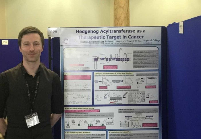 Many congratulations to Tom for winning runner-up prize for his poster at the recent RSC Chemical Biology Symposium. Tom's poster described his recent work on 'Hedgehog Acyltransferase as a Therapeutic Target in Cancer', building on his past research and publications on this area with colleagues in the Tate group.