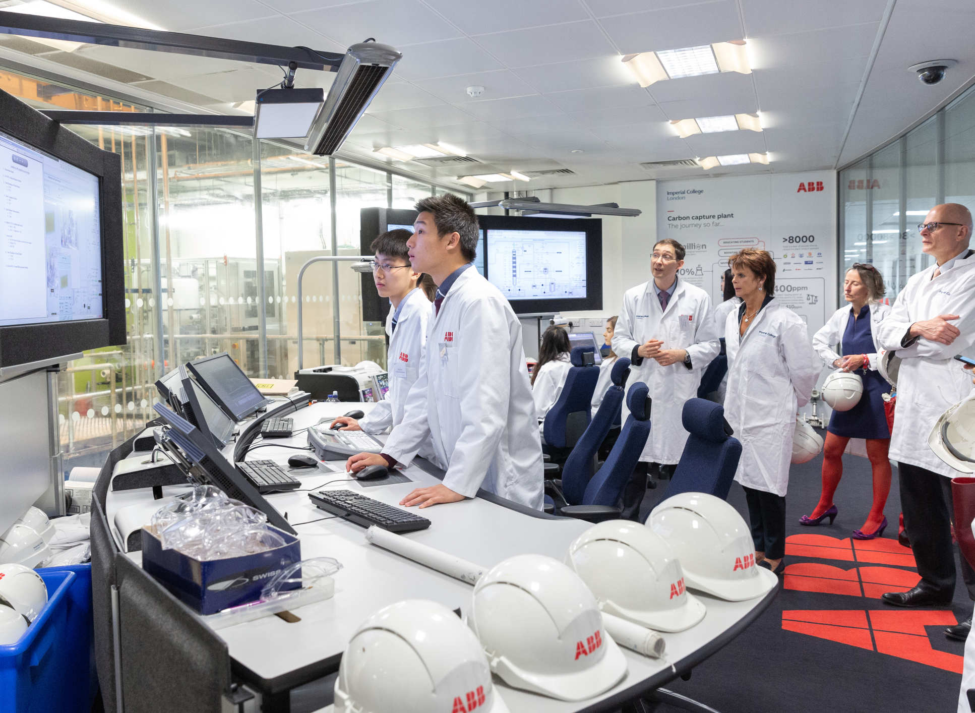 The group were then taken to the Carbon Capture Pilot Plant, where they were met by Dr Colin Hale and ten chemical engineering students. They were shown the four-storey state-of-the-art facility, which represents a scaled-down chemical engineering plant. Dr Hale explained how the plant gives students real-world, hands-on industrial experience, and the group were given a demonstration of a simulated emergency which was then solved by the student volunteers.