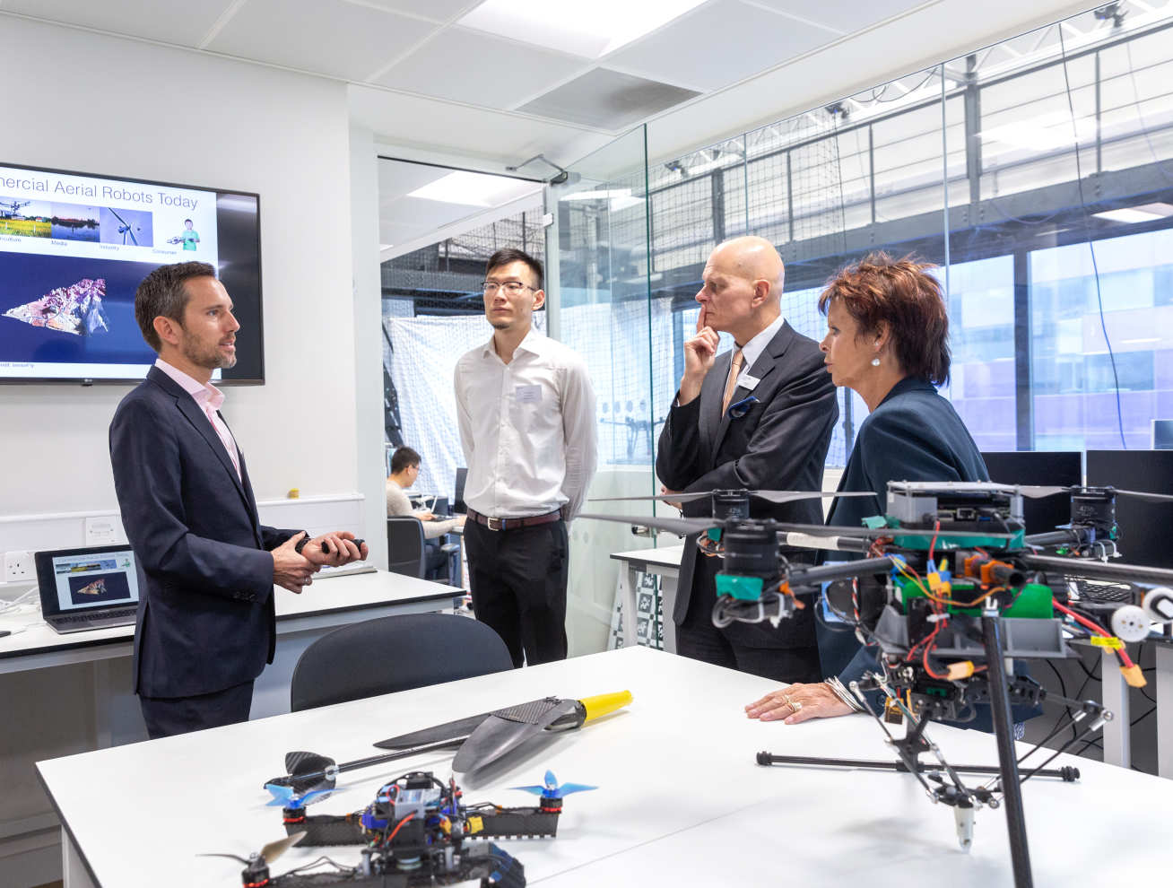 The visit included tours and demonstrations at the Aerial Robotics Lab, the Carbon Capture Pilot Plant and the Dyson School of Design Engineering.