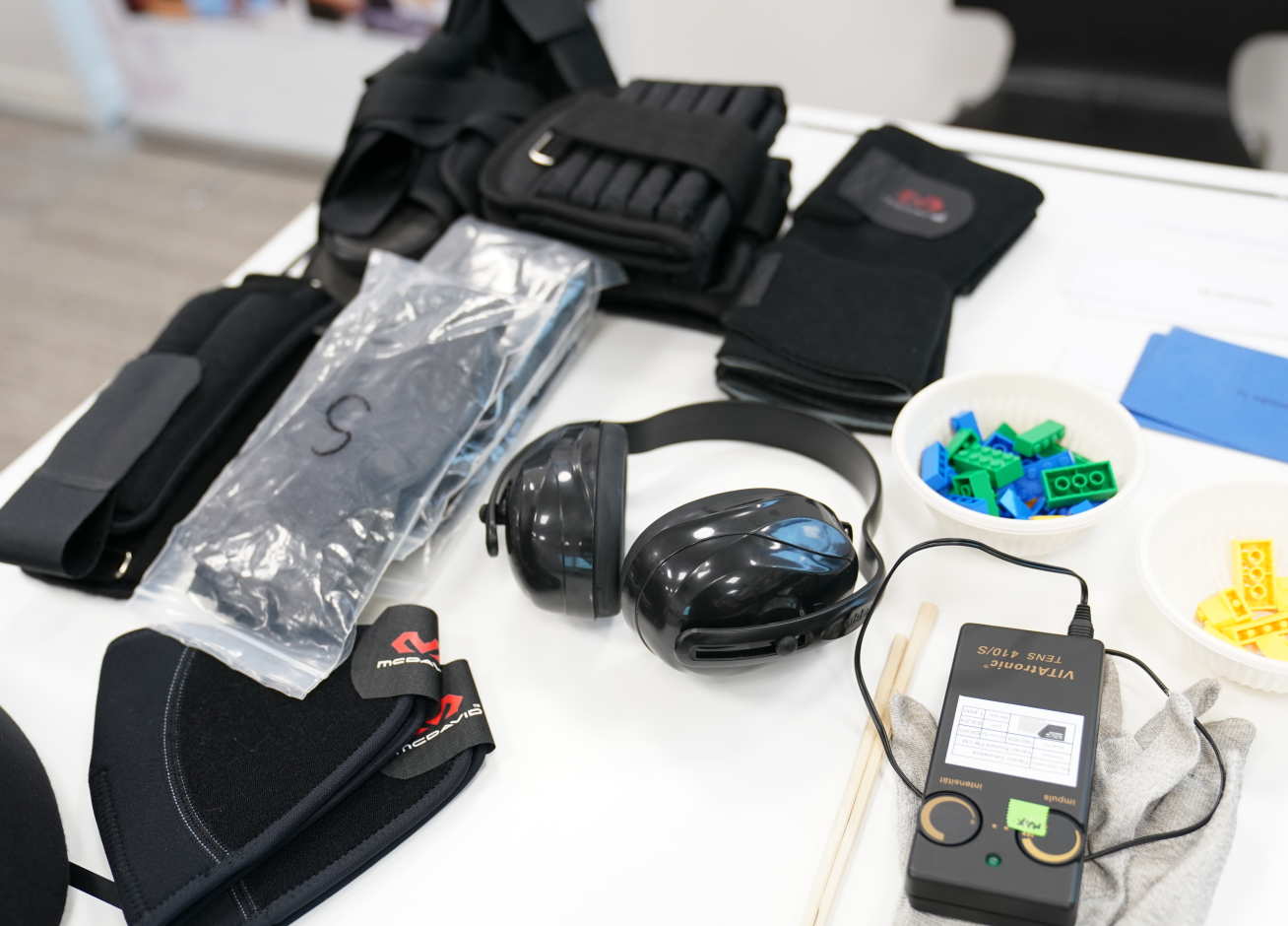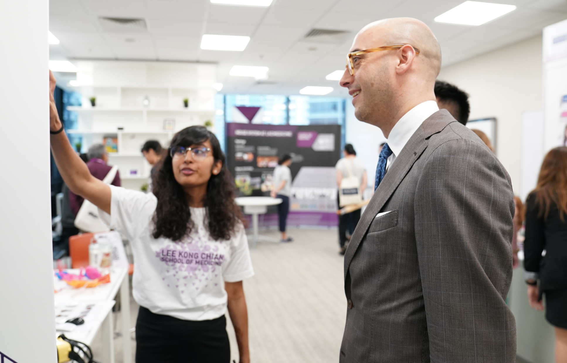 Among the exhibitors were a group of first-year LKCMedicine students demonstrating ageing simulation tools that help them experience age-related physical impairments, including a narrowing field of vision, high-frequency hearing loss, head mobility restrictions, joint stiffness, loss of strength and grip, as well as reduced coordination skills. Attendees could try on a pair of tremor-inducing gloves while attempting to use chopsticks – one small way students are working to have greater empathy and understanding of their patients.