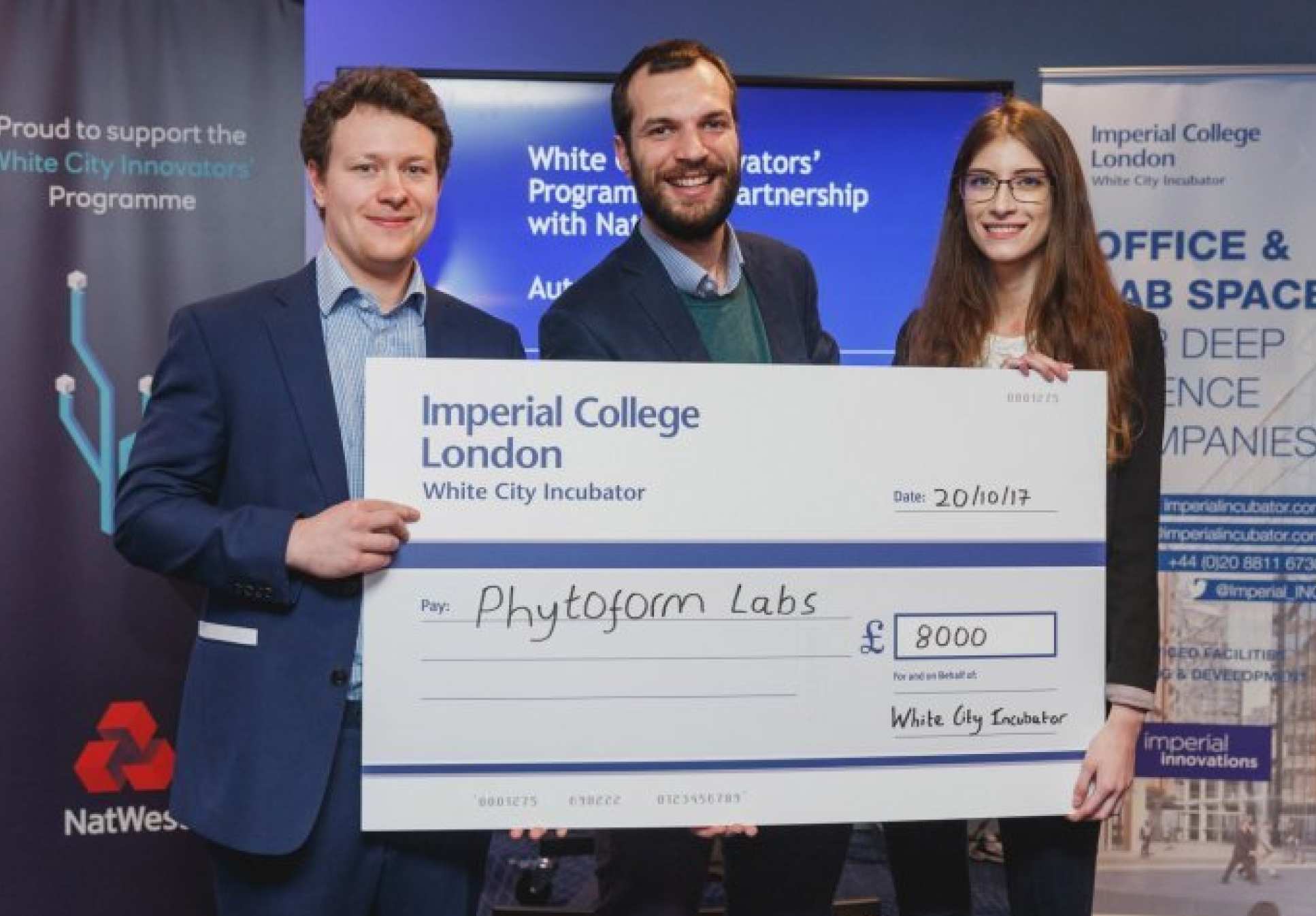 3 members of Phytoform Labs holding a cheque for 8000Phytoform Labs, a start-up founded by PhD students Will Pelton and Nicolas Kral, claimed first prize in the White City Incubator Innovators’ Programme, winning £8,000 and membership to the White City Incubator hub. Participants in the Climate-KIC Accelerator programme, Phytoform Labs use gene editing technologies to hone plant breeds in months rather than decades. Their work could increase yields and improve the economics of breeding valuable vegetable crops, as well as boost resilience to climate change and diseases.