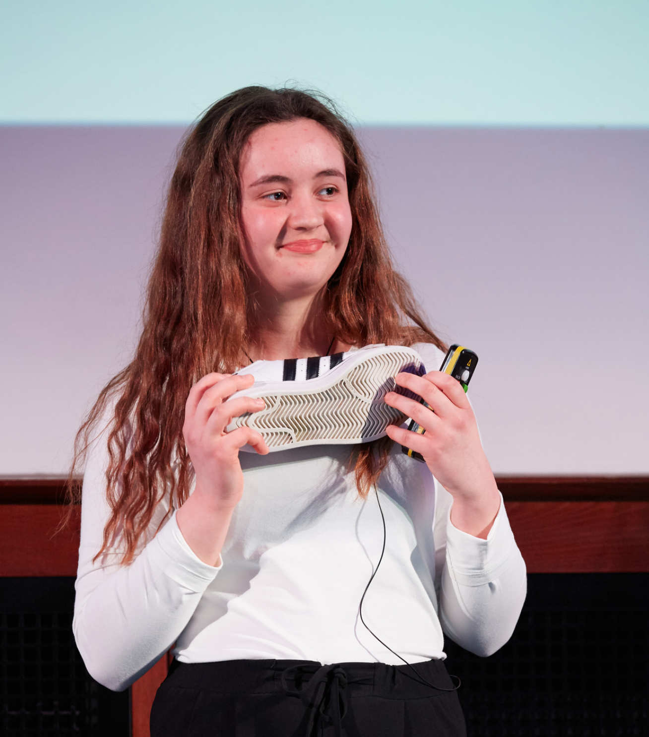 Cindy’s won the award for creating trainers with built-in speakers which can be connected to a device via Bluetooth, such as a smartphone. Next, she aims to find a way for the trainers to be powered using kinetic energy by charging the shoes as the wearer moves.
