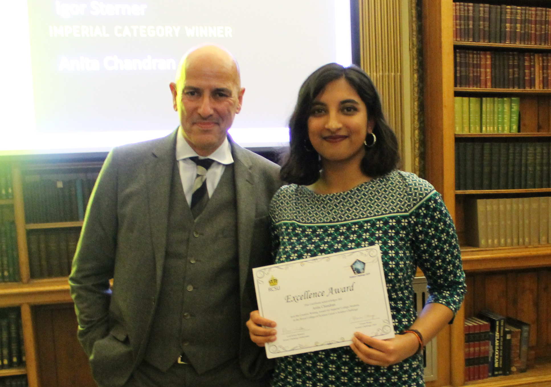 Horizons alumna and Physics PhD student, Anita Chandran, has scored a double victory in the RCSU Science Challenge with her excellent short story on Art and Artificial Intelligence. Her award - a trophy and £1,000 for the category and overall winner - was presented at the Royal Society by Lord Winston.