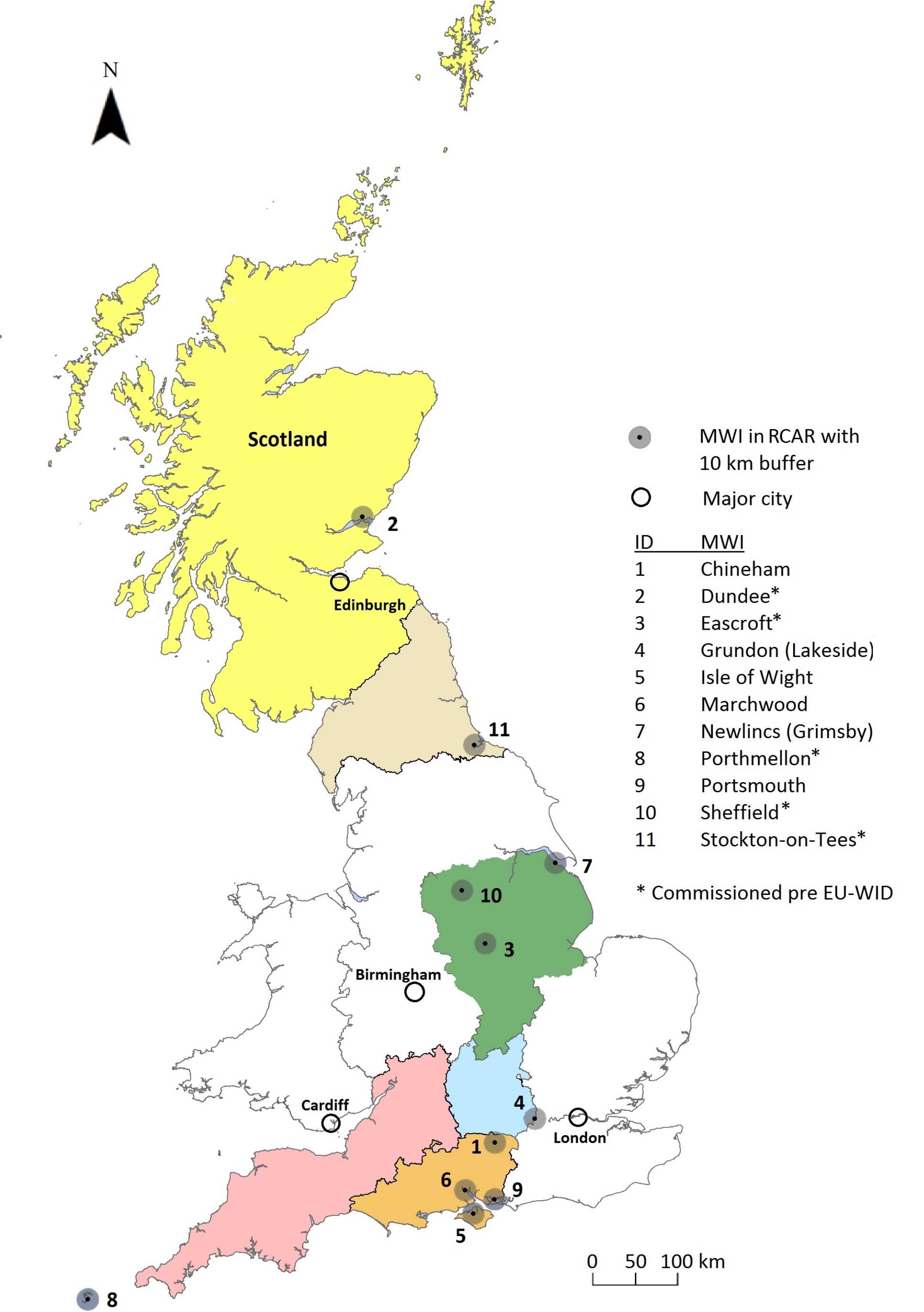 The 10 incinerators in the births defects study were: Chineham, Hampshire; Dundee, Scotland; Eastcroft, Nottinghamshire; Isle of Wight; Marchwood, Hampshire; Grimsby, Lincolnshire; Porthmellon, Scilly Isles; Portsmouth, Hampshire; Sheffield, South Yorkshire; Stockton-on-Tees, County Durham.