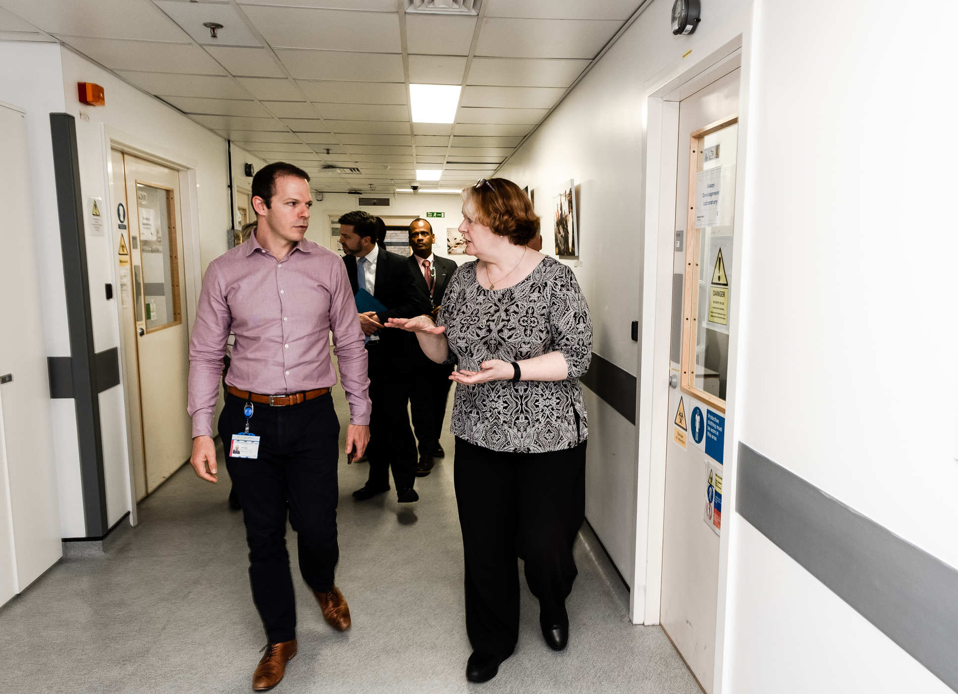 Dr Whitford was given an extensive tour of the IAVI Good Clinical Laboratory Practice (GCLP) facilities. In the Flow Cytometry Suite, she discussed with Imperial’s Dr Lucas Black the technological change that immunology and vaccination research has undergone in recent decades, examining HIV+ blood cells, for example, with a much greater efficiency.