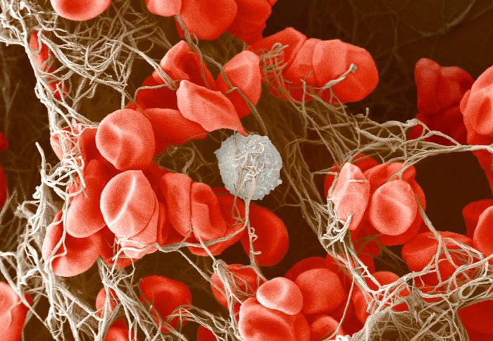 Image description: Colour-enhanced image of a blood clot. There are many red blood cells and a single white blood cell held together in a meshwork of fibrin (brown).