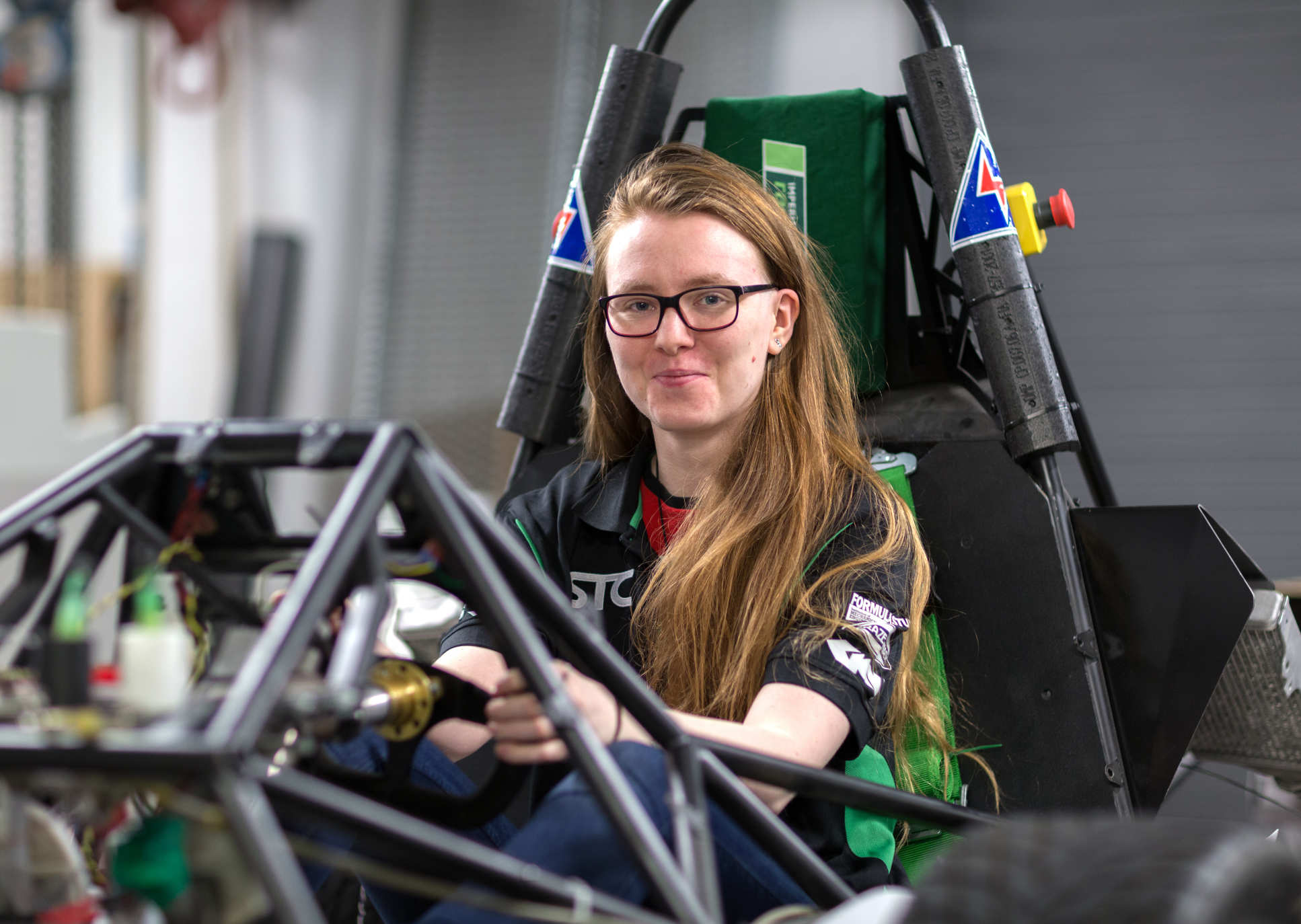 A  mechanical engineering undergraduate in the pit garage with the Formula Student Car.