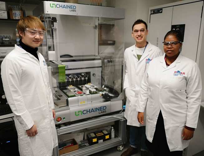 Project team members in the ROAR lab (l-r): Dr Ben Deadman, Roddy Stark, Valerie Maswanganyi and Simeng Wang