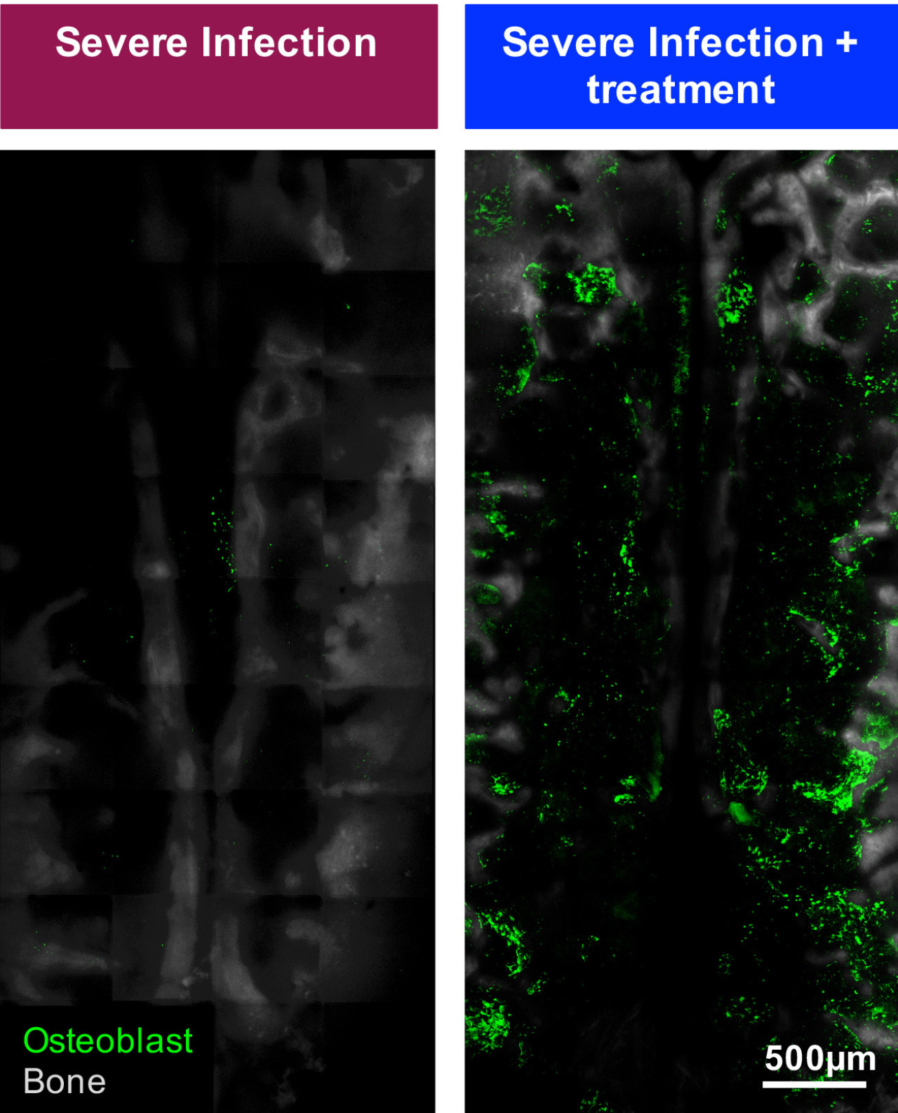 Bone-forming cells called osteoblasts shown in green