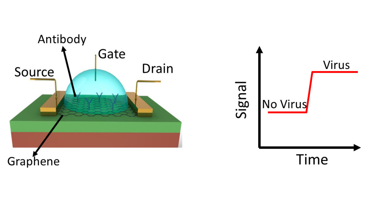 Figure 1. GFET structure (left). GFTE measures the electrical signal between source and drain; when the virus is captured on the antibody, the electrical signal (resistance) changes as indication of the presence of virus (right).