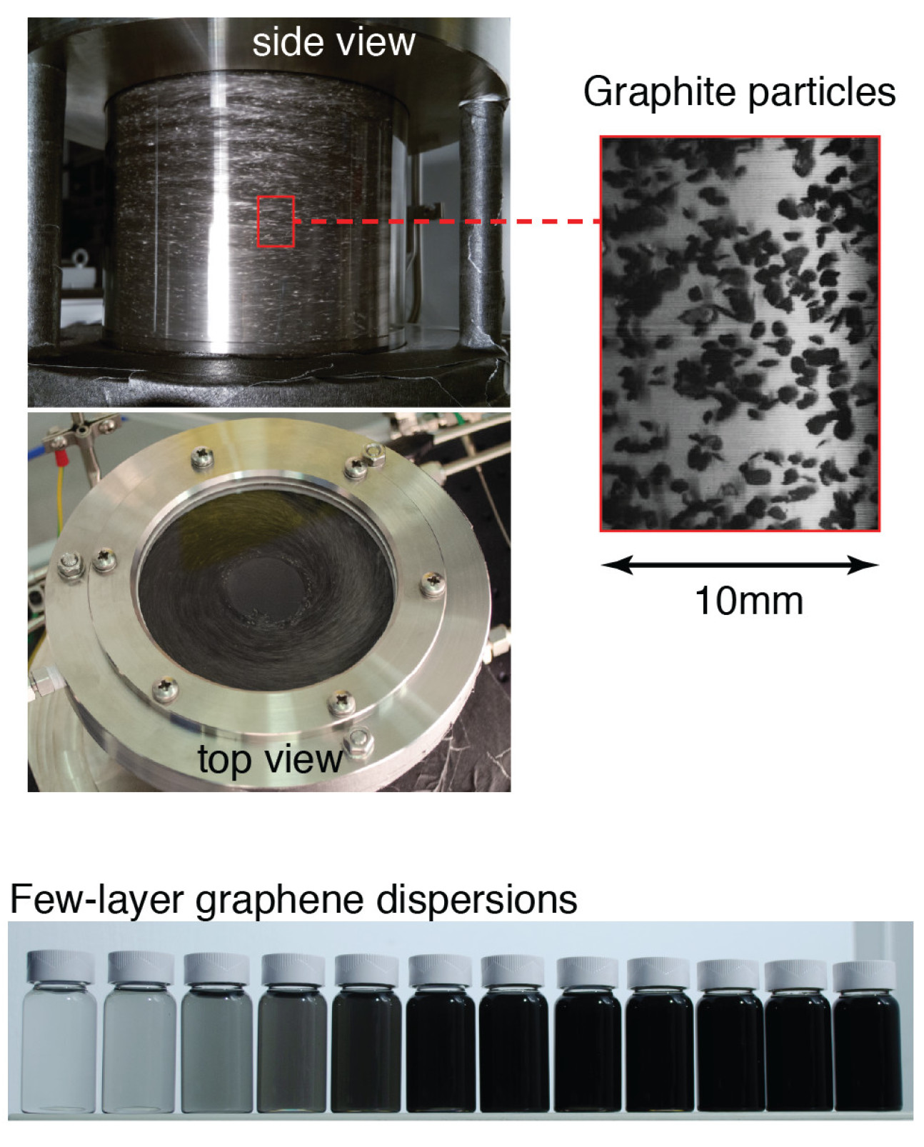 Both methods involved pumping liquids containing graphite particles through intense mixing environments, either over a rapidly rotating disc, or through a thin gap between two counter-rotating cylinders.