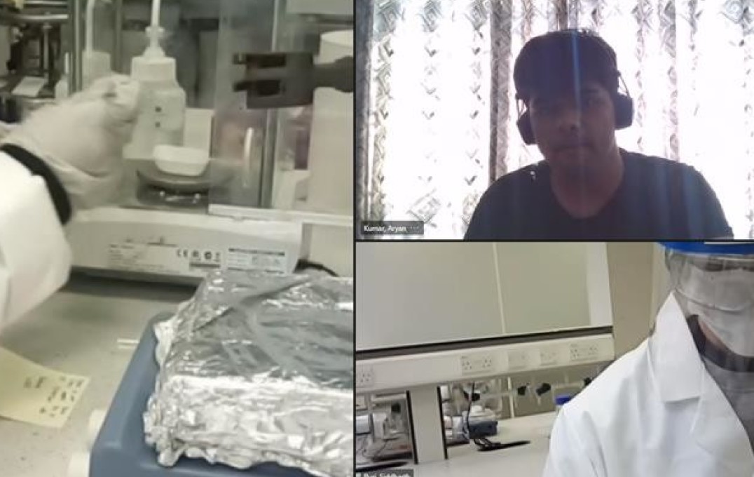 Using the newly installed tablet devices, lab partners and Graduate Teaching Assistants (GTAs) can now interact virtually through MS Teams. The remote and in-person linkup allows remote students to focus on literature research while their in-person partner carries out measurements. Remote students can also complete calculations and feed that information back to the in-person student.