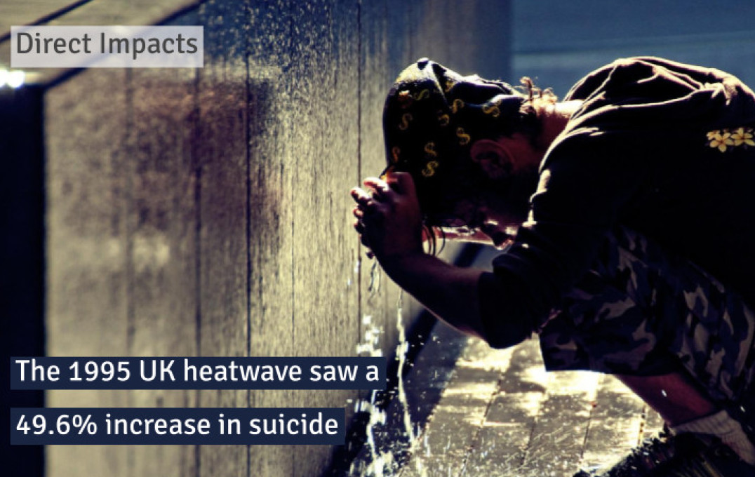 - Rising local temperatures are strongly associated with increased rates of suicide (1% for every 1°C temperature rise) and reduce population mental wellbeing