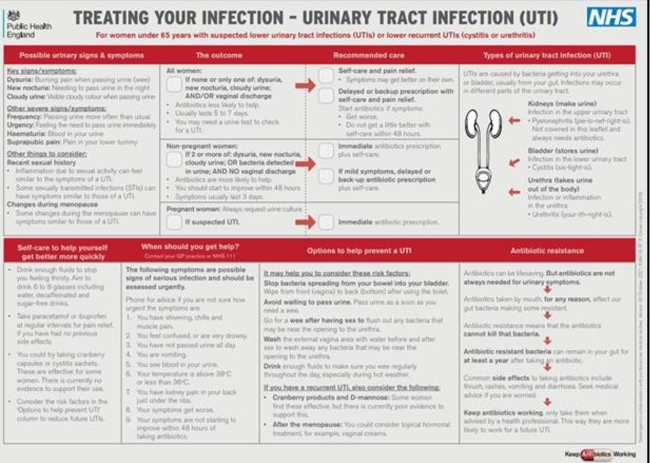 The leaflets detailed the nature of UTIs, prevention advice, signs and symptoms of concern for a UTI, self-care measures that can be taken to improve recovery, treatments that can be prescribed by GPs and dispensed by pharmacists, and warning signs that should prompt emergency consultation.